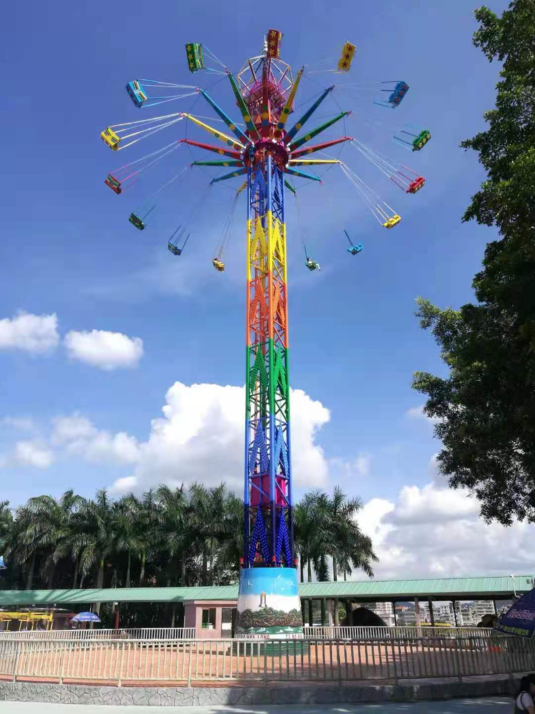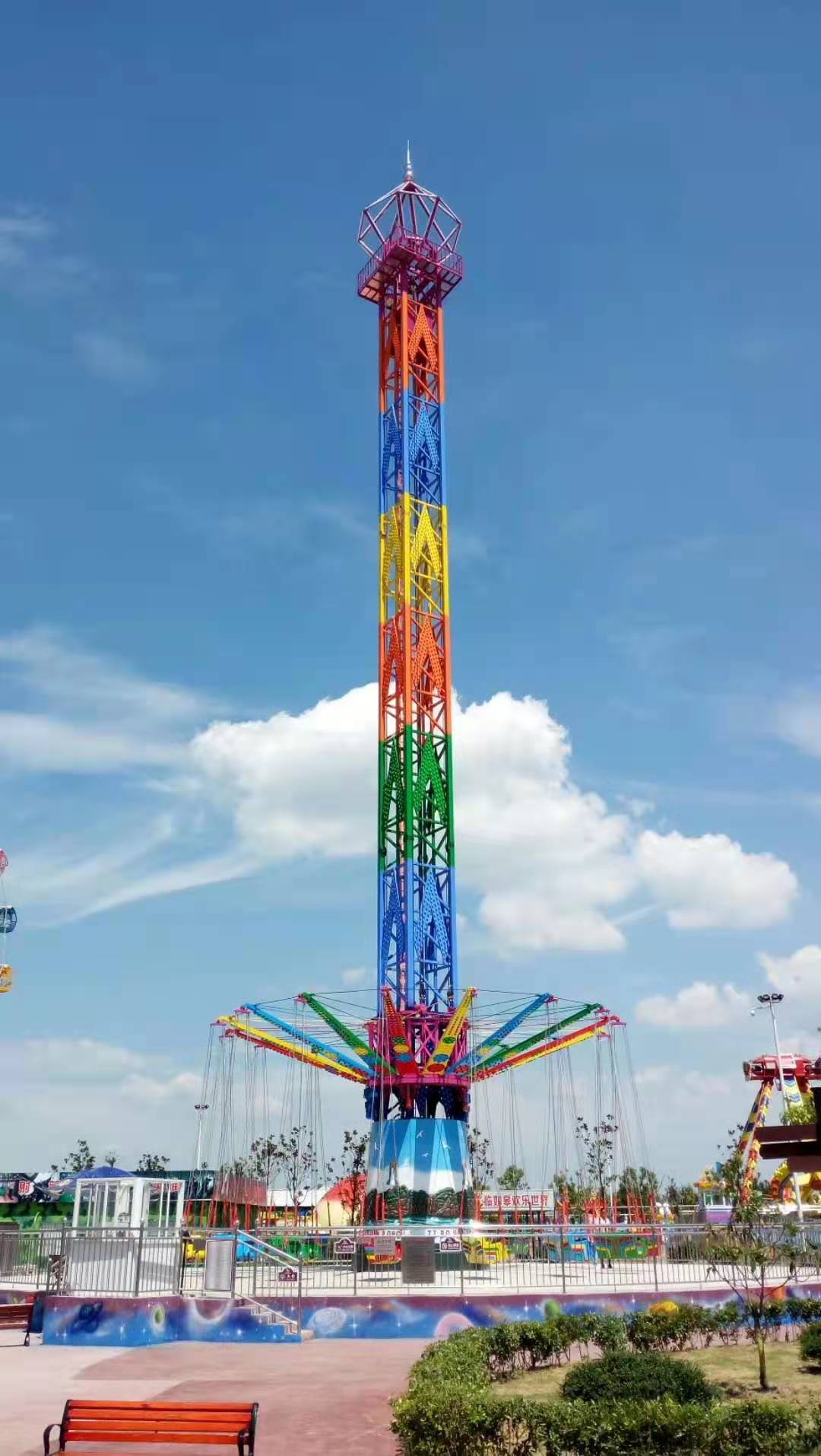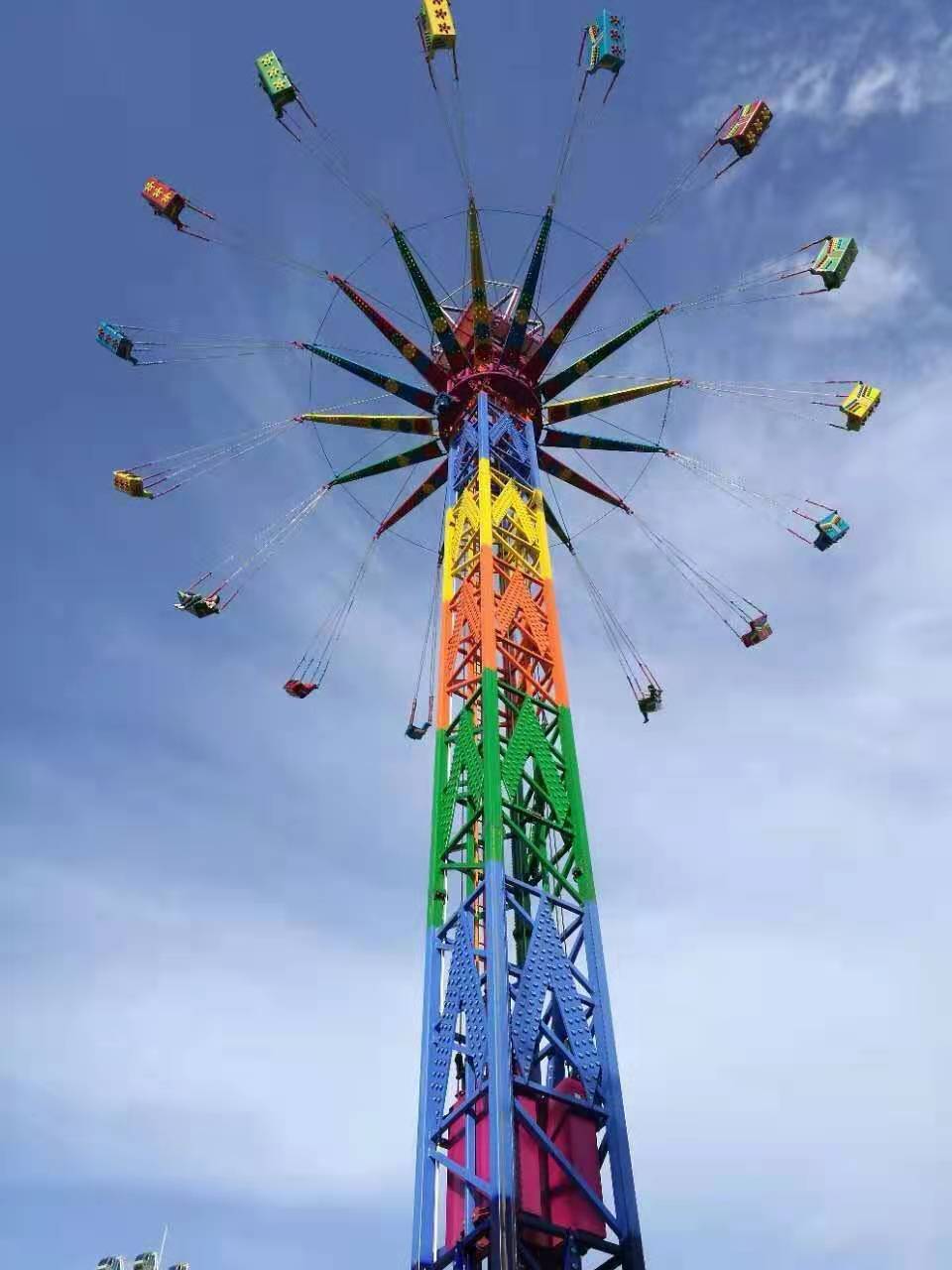 大型高空飛翔 大型高空飛(fēi)翔 安裝型式:固定式 設備級別(bié):A級 設備高度:55.8米 承(chéng)載人數:36人 功率(lǜ)KW:82kw 在線谘詢 產品詳(xiáng)情 GF-36A高空飛翔,是我公司根據市場需求,新近開發的一種飛行塔類大型遊樂設施。采(cǎi)用本公司(sī)專利技術,結構宏偉、裝飾簡潔典雅,遊樂效果(guǒ)上乘。 乘客隨(suí)座椅用圓環鏈懸掛於轉盤上,隨轉盤同時作旋轉和上、下的複合運動,使乘客感受旋轉離心力和運行高度的無(wú)窮樂趣。該專利技術一改(gǎi)此類遊樂設(shè)備結構複雜、成本偏高等諸多弊(bì)端,使購買費用大(dà)大降低,運行維護成本減少,是老少(shǎo)皆宜,集娛樂性、驚險性和刺激性於一體的地標性遊樂設施。 夜晚來(lái)臨,其(qí)高聳的塔身,在遊樂園中(zhōng)更顯尊貴;五彩的燈光,在隨乘客旋轉運動中,猶如一道道(dào)彩虹當(dāng)空舞,更顯絢麗奪目(mù),富麗繽紛。 它(tā)必將成為遊樂場或嘉年華活動中一款理想的遊樂產(chǎn)品(pǐn)。以最小的運行成(chéng)本(běn),獲得最大經濟效益。 該設(shè)備充分考慮運輸、安裝等(děng)方(fāng)麵的實際需要,采用分體式結構,具有(yǒu)科技含量高,運行成本低廉,設備維(wéi)護簡單,乘坐(zuò)安全舒(shū)適,投資回報豐厚等突(tū)出特點。 該設備主要投放(fàng)市場有(yǒu)山西省太原市迎澤公園、陝西省西安市世博(bó)園、四川省巴中置信嘉年(nián)華樂園現場、北京市通州區(qū)大運河森林公(gōng)園、山西陽泉(quán)市桃林(lín)溝(gōu)遊樂園、廣西桂林樂滿地度(dù)假世界主題公園、四(sì)川自貢市(shì)沿灘新城創興城等遊樂園。設備主要參數:安裝型式設備級別設備高度運行高(gāo)度功率占地麵承載人固定大(dà)型A(國(guó)檢)55.8米36.8米82 kW直徑30m36人(rén)中型B(省(shěng)檢)43.8米29米67 kW直徑24m32人小型B(省檢)31.8米18米67 kW直徑22m32人